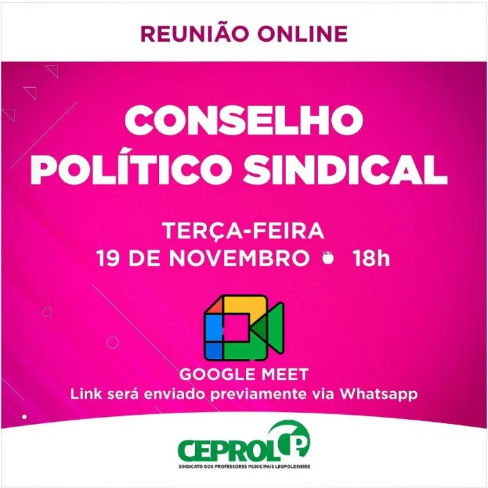 Nesta terça-feira (19/11) às 18h ocorrerá o nosso conselho político sindical reunindo com as representações eleitas nas escolas para dialogar e definir coletivamente as ações do sindicato. Participe!O link da reunião irá para o grupo do CPS.🍏CEPROL: UNIDADE NA DIVERSIDADE.