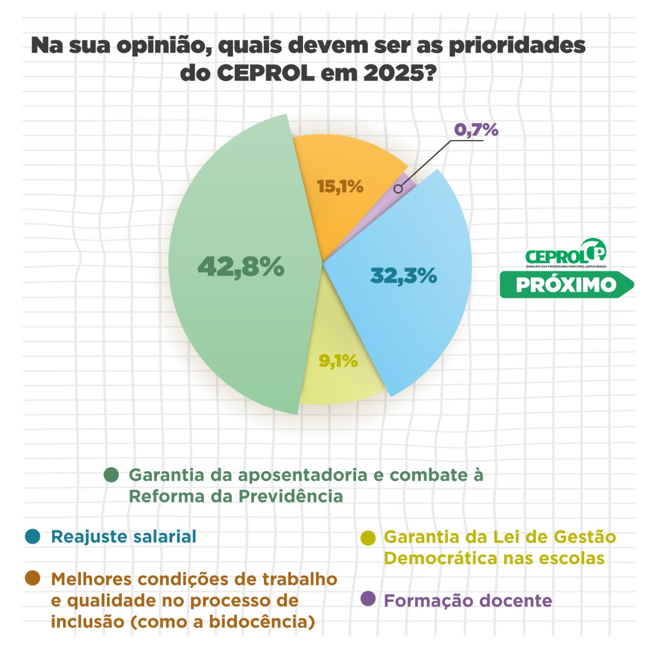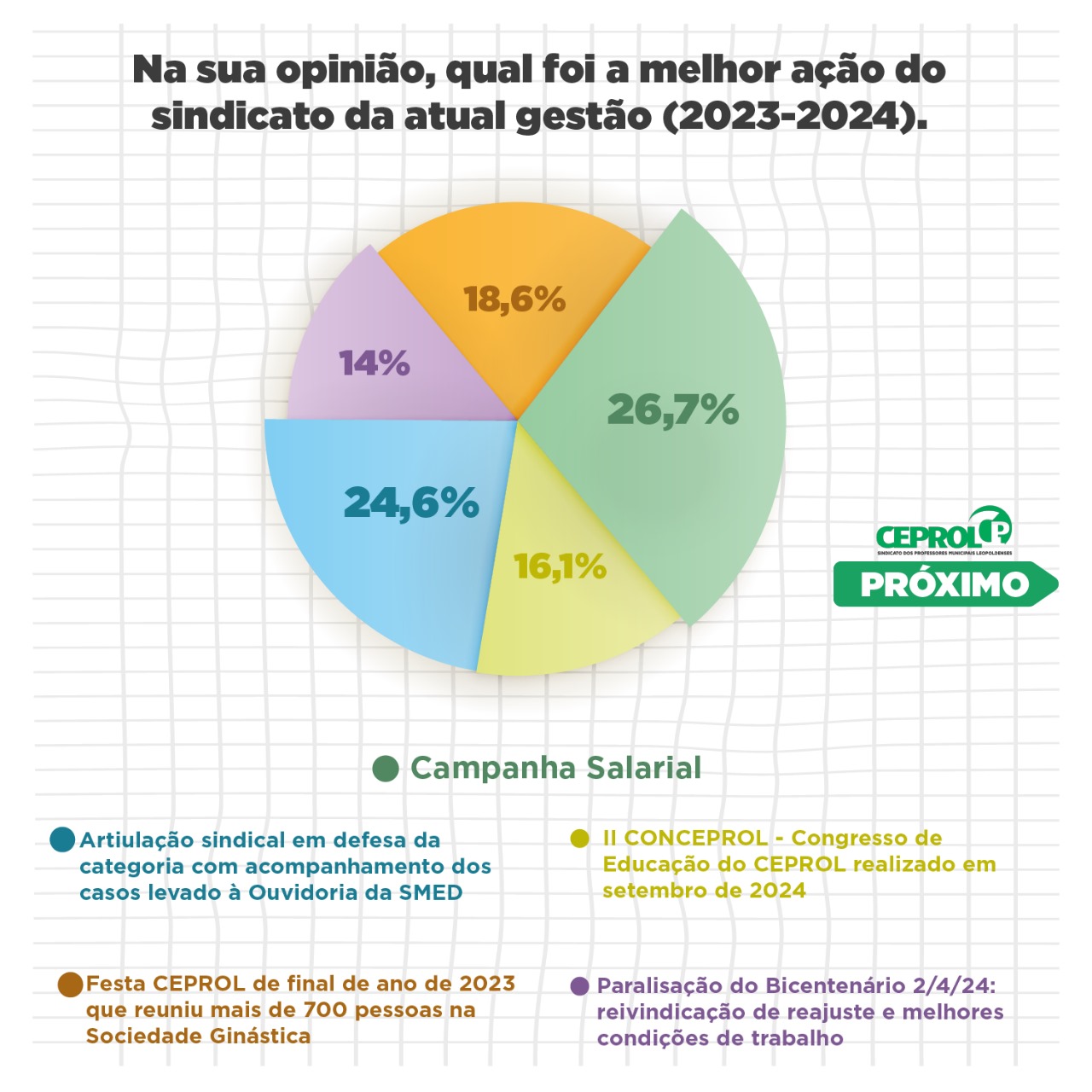 ERRATA: Na revista CEPROL EM AÇÃO Nº 3 de dezembro de 2024, que será lançada na noite desta sexta-feira, 13 de dezembro, na Festa CEPROL HOUR MISTÉRIOS, no Sociedade Recreativa Ipiranga, em São Leopoldo, há um pequeno erro num dos gráficos da PESQUISA. Na primeira “pizza” aparece duas vezes a palavra “supervisor(a)”. Na segunda que aparece, leia-se *diretor(a)”.
