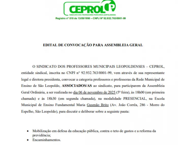 O CEPROL Sindicato convoca a categoria professores e professoras da Rede Municipal de Ensino de São Leopoldo, ASSOCIADOS/AS ao sindicato, para participarem da AssembleiaGeral Ordinária.🗓️Dia: 06/11/2025 (5ª feira);🕢Horário: 18h00 (em primeirachamada) e 18h30 (em segunda chamada);📍Local: EMEF Maria Gusmão Brito.📢Pauta:•Mobilização em defesa da educação... Leia mais