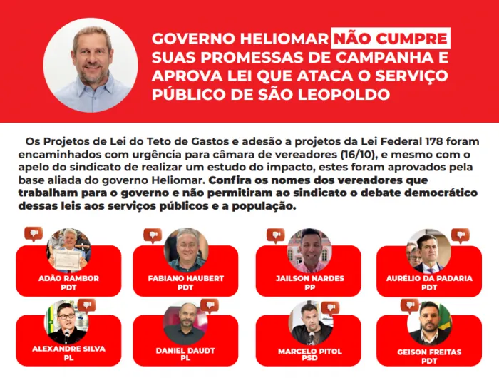 Atenção População de São Leopoldo🚨⚠️ O Governo Heliomar ataca o serviço público e o povo leopoldense ao aprovar a lei de Teto de Gastos e o aumento do IPTU.✊🏾Convidamos você a se unir em defesa dos seus direitos!✊🏾Junte-se à luta em defesa dos serviços públicos, da escola pública, do SUS... Leia mais