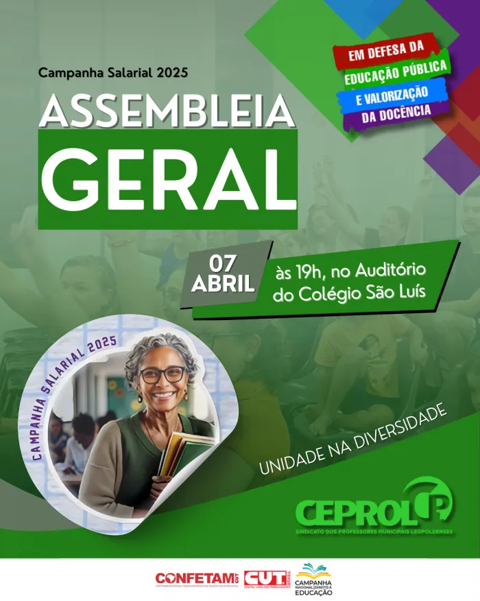 ✊🏽CHAMADA PARA ASSEMBLEIA GERAL DO CEPROLCAMPANHA SALARIAL 2025📌No dia 07/04 (segunda-feira), às 19 horas, no auditório do Colégio São Luís (rua João Corrêa, 1300, Centro), ocorrerá a Assembleia Geral do CEPROL Sindicato.🤝Esperamos a presença de toda a categoria para decidir os próximos passos da nossa Campanha Salarial.🌈CEPROL: UNIDADE NA DIVERSIDADE! Leia mais
